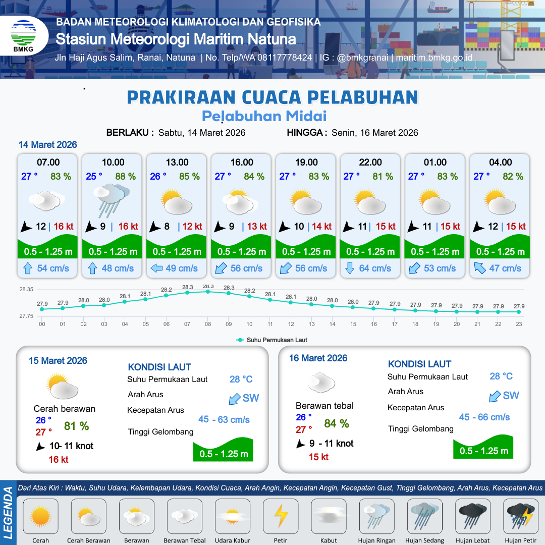 11 Mar 26, 14.00 6 jam yang lalu | Berawan Tebal | Timur Laut 9 kt Gust Peningkatan kecepatan angin yang singkat dan tiba-tiba : 14 kt | | | 10 km | 27 °C | 83 % | +0.54 m |