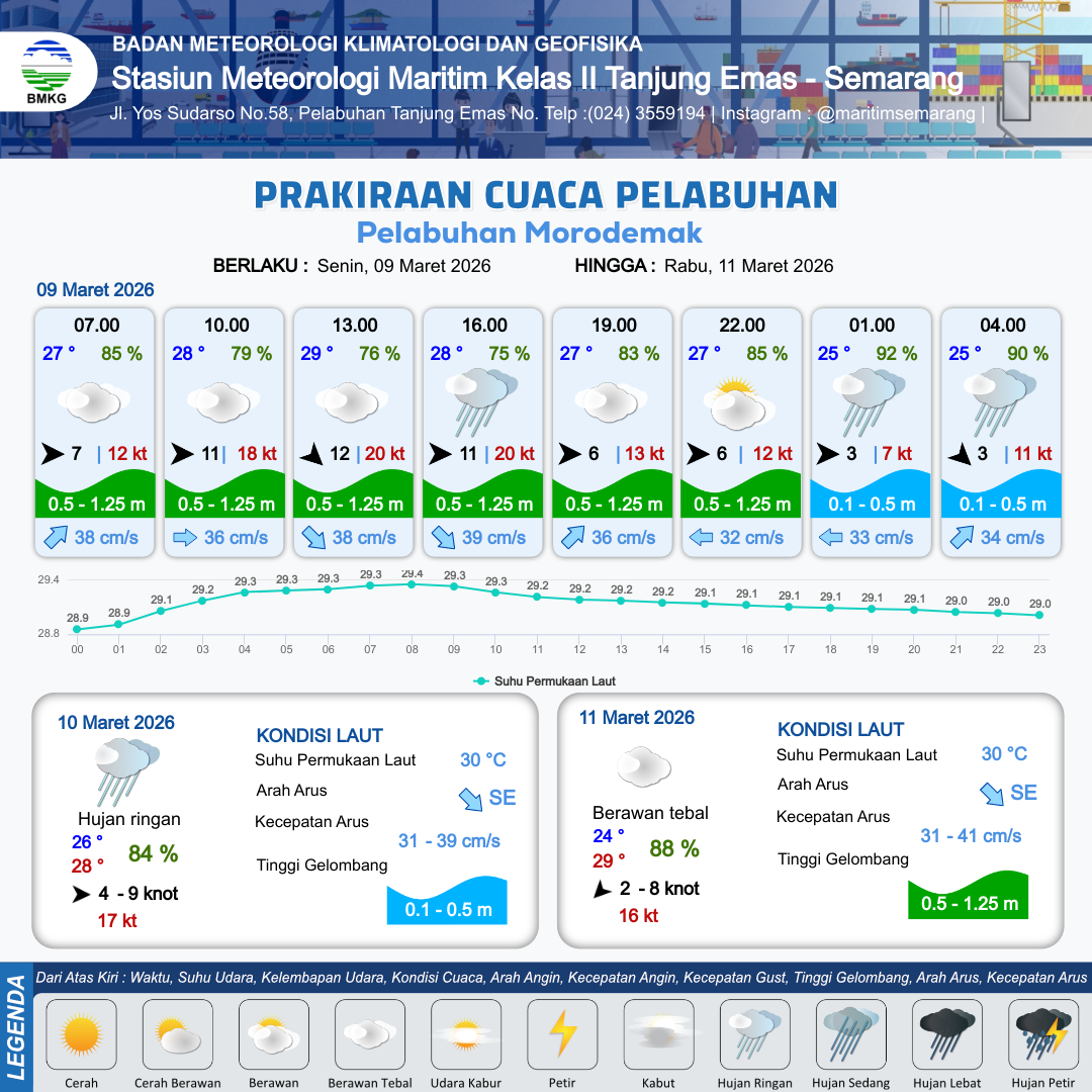 9 Mar 26, 19.00 2 jam kedepan | Hujan Ringan | Barat 3 kt Gust Peningkatan kecepatan angin yang singkat dan tiba-tiba : 10 kt | | | 7 km | 25 °C | 91 % | +0.20 m |