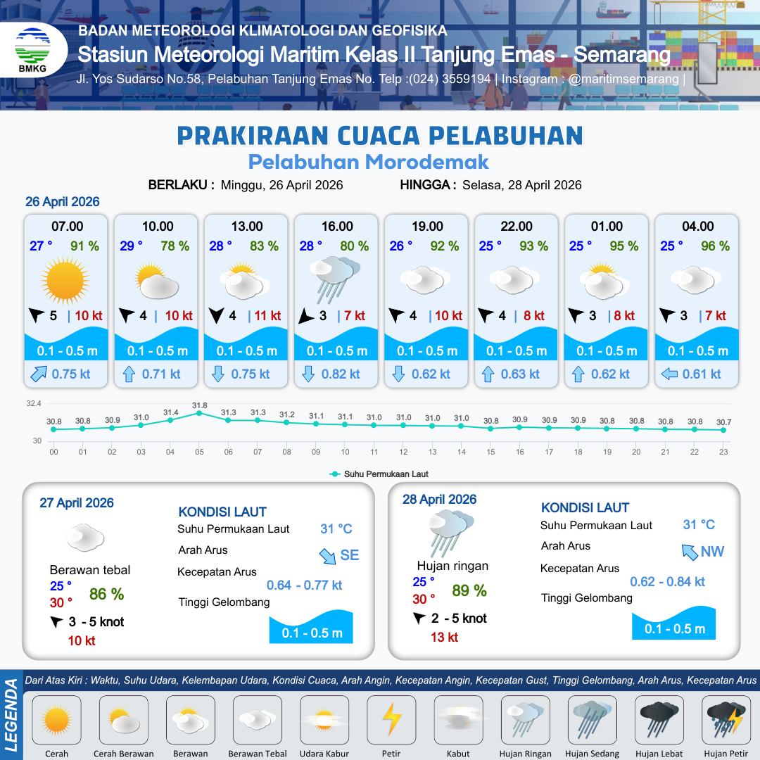 24 Apr 26, 08.00 12 jam yang lalu | Hujan Ringan | Timur Laut 2 kt Gust Peningkatan kecepatan angin yang singkat dan tiba-tiba : 9 kt | | | 6 km | 28 °C | 82 % | +0.78 m |