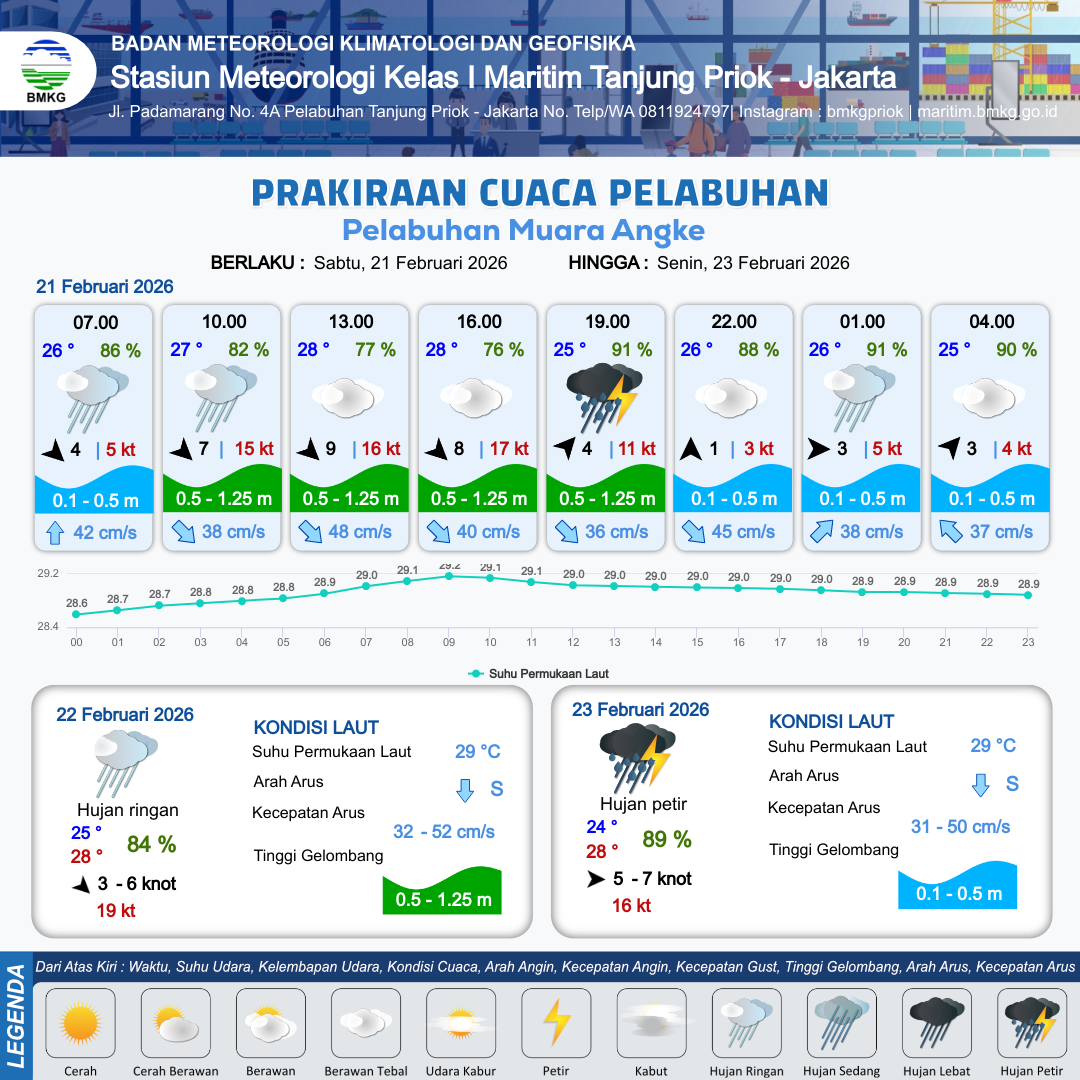 21 Feb 26, 07.00 13 jam yang lalu | Berawan Tebal | Barat Laut 9 kt Gust Peningkatan kecepatan angin yang singkat dan tiba-tiba : 17 kt | | | 10 km | 28 °C | 76 % | +0.02 m |