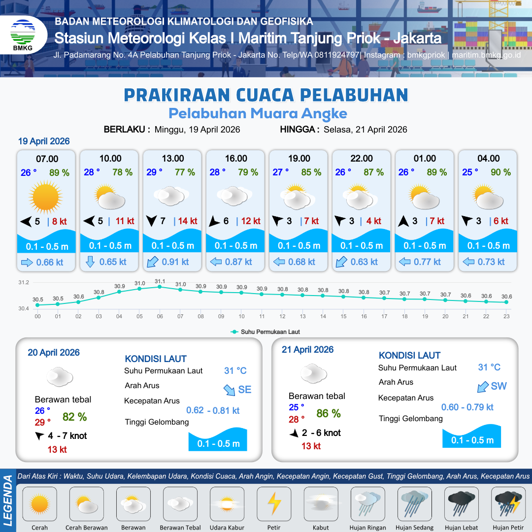 17 Apr 26, 22.00 2 jam kedepan | Hujan Ringan | Timur 4 kt Gust Peningkatan kecepatan angin yang singkat dan tiba-tiba : 6 kt | | | 10 km | 26 °C | 89 % | +0.65 m |