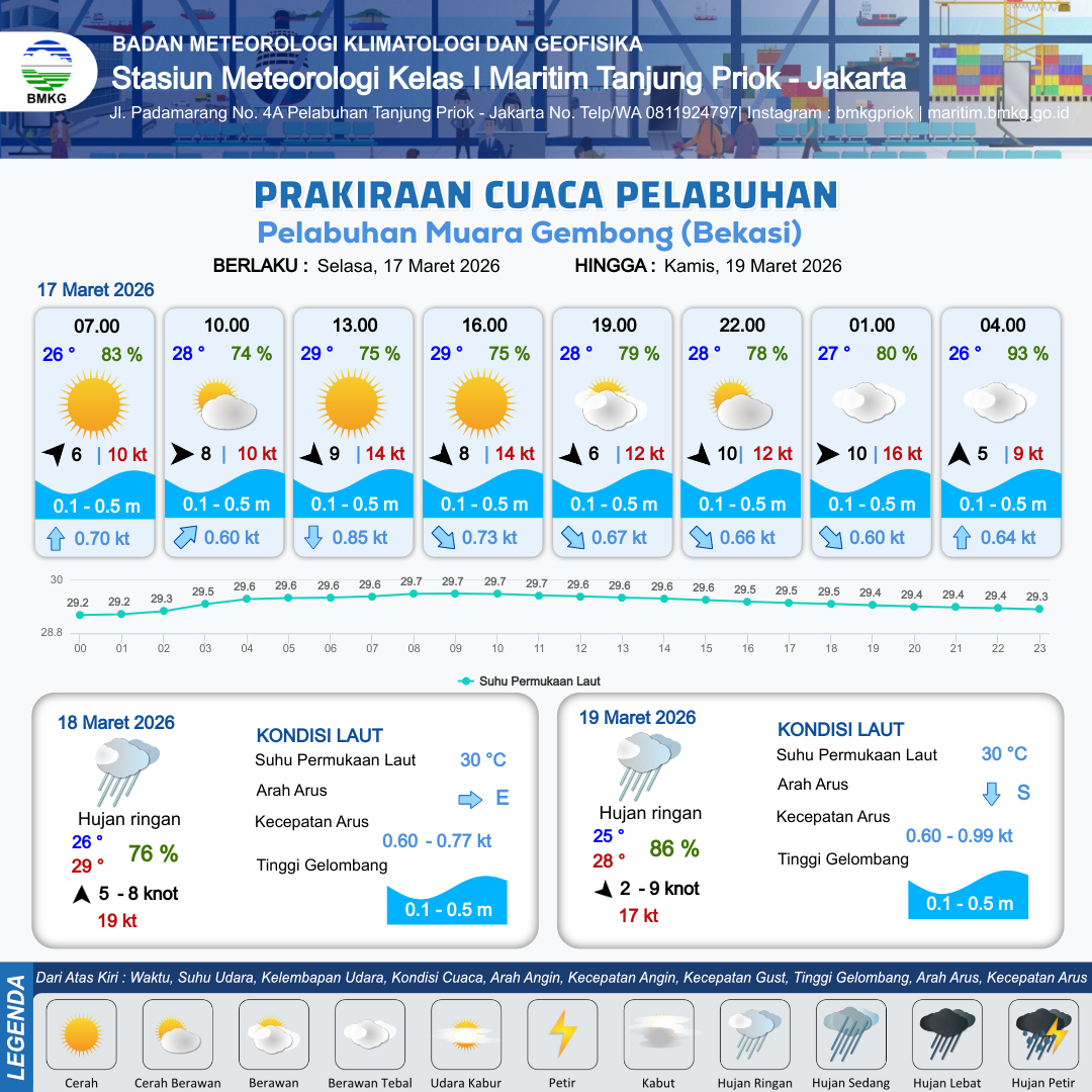 17 Mar 26, 09.00 Saat ini | Barat Laut 8 kt Gust Peningkatan kecepatan angin yang singkat dan tiba-tiba : 14 kt | 0.5 m Rendah | Tenggara 0.7 Knot | 10 km | 29 °C | 75 % | -0.21 m | |