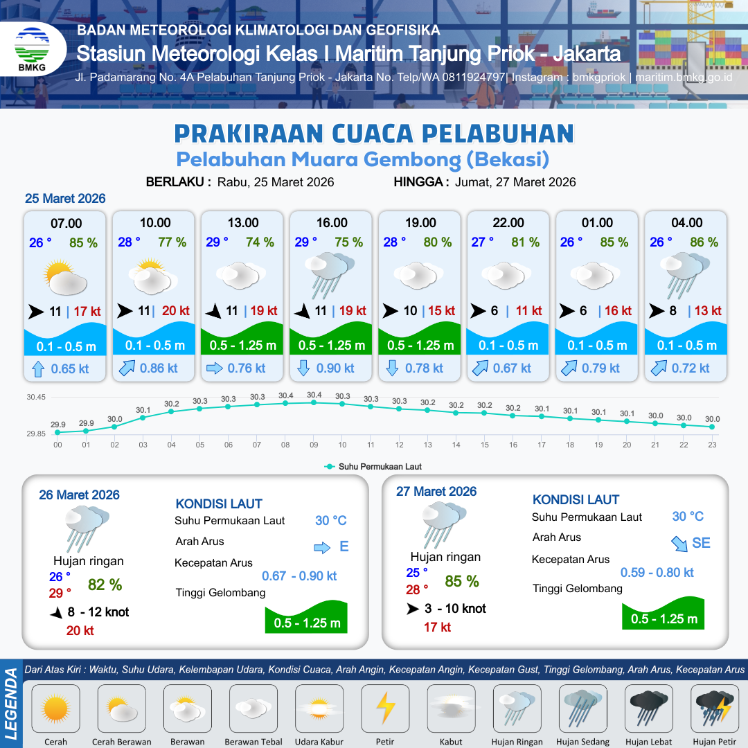 26 Mar 26, 22.00 24 jam kedepan | Barat 7 kt Gust Peningkatan kecepatan angin yang singkat dan tiba-tiba : 14 kt | 0.7 m Rendah | Selatan 0.9 Knot | 8 km | 22 °C | 93 % | +0.26 m | |