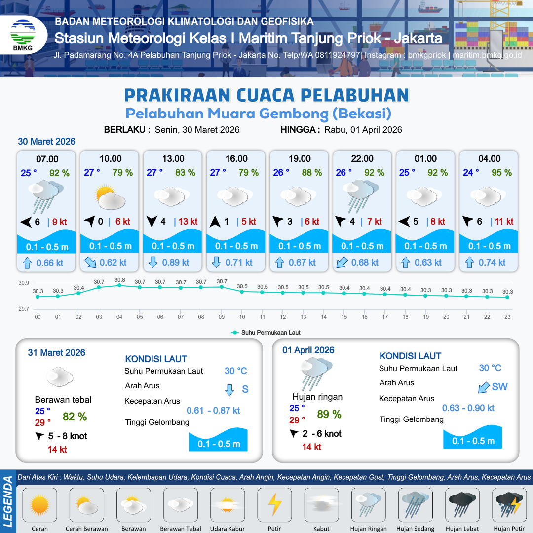 30 Mar 26, 23.00 11 jam kedepan | Timur 5 kt Gust Peningkatan kecepatan angin yang singkat dan tiba-tiba : 10 kt | 0.1 m Tenang | Utara 0.8 Knot | 8 km | 24 °C | 93 % | -0.02 m |