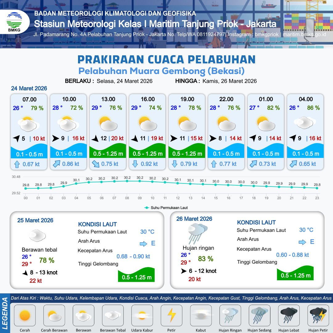24 Mar 26, 07.00 12 jam yang lalu | Cerah Berawan | Barat Laut 12 kt Gust Peningkatan kecepatan angin yang singkat dan tiba-tiba : 20 kt | | | 8 km | 29 °C | 75 % | -0.31 m |