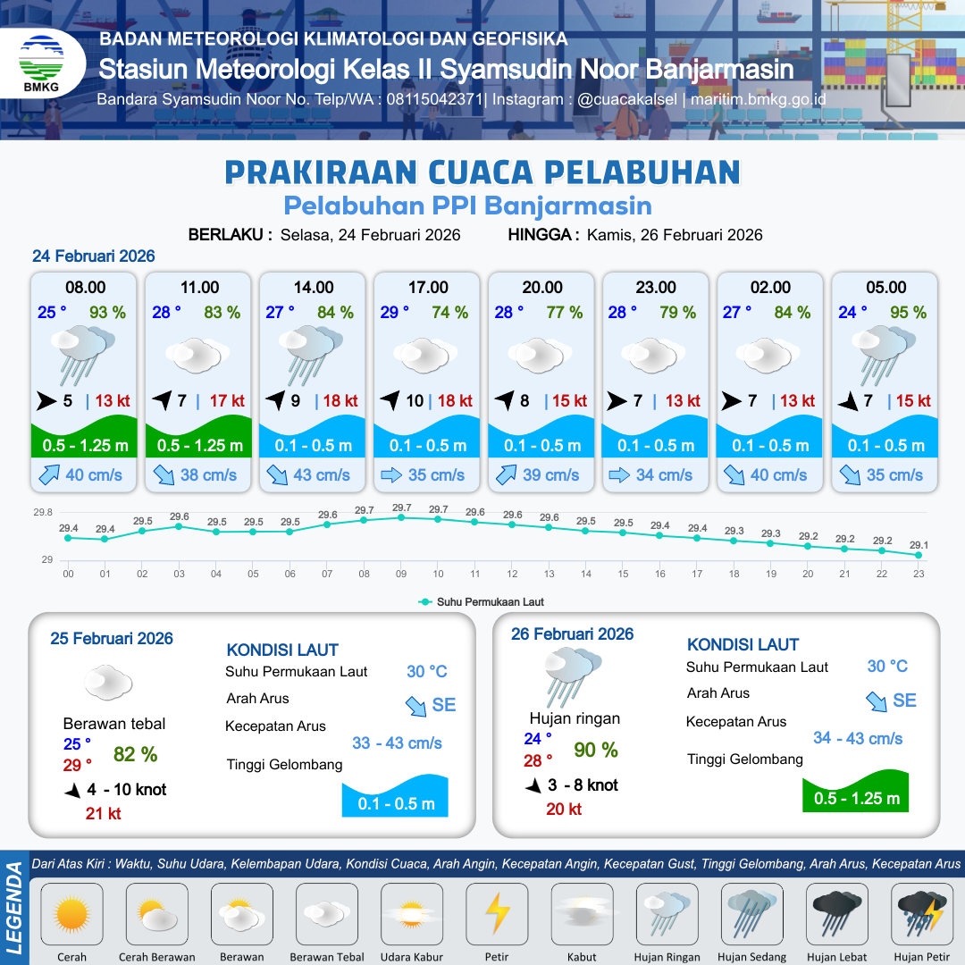 25 Feb 26, 08.00 10 jam kedepan | Barat Daya 6 kt Gust Peningkatan kecepatan angin yang singkat dan tiba-tiba : 16 kt | 0.3 m Tenang | Timur Laut 57.0 cm/s | 10 km | 29 °C | 71 % | +0.14 m | |
