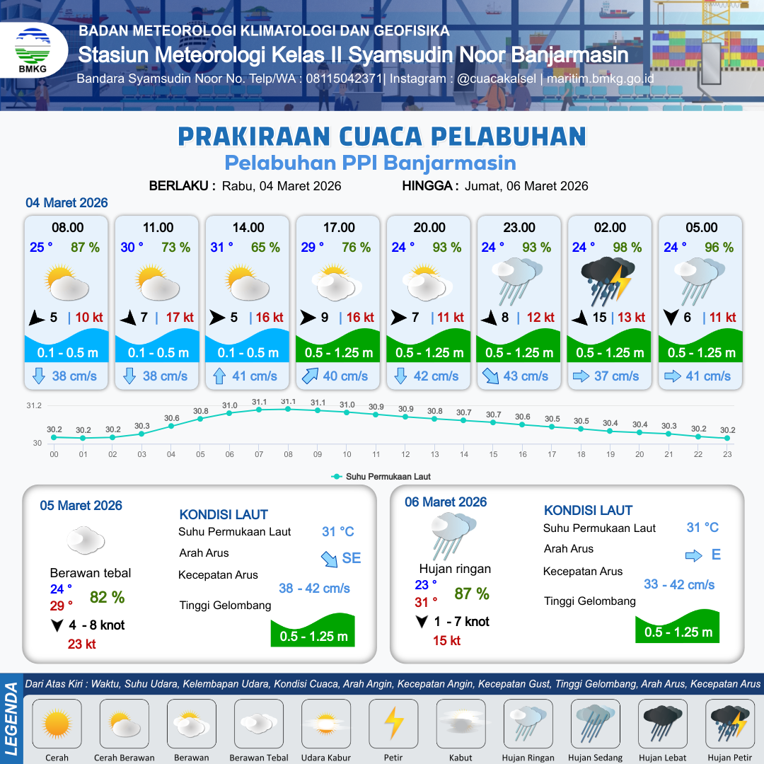 4 Mar 26, 19.00 3 jam kedepan | Barat Laut 5 kt Gust Peningkatan kecepatan angin yang singkat dan tiba-tiba : 12 kt | 0.3 m Tenang | Timur 37.0 cm/s | 6 km | 24 °C | 95 % | +0.61 m | |