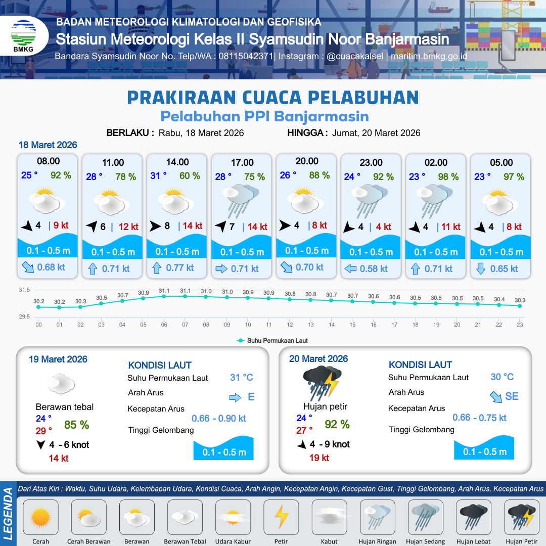 18 Mar 26, 11.00 Saat ini | Barat 5 kt Gust Peningkatan kecepatan angin yang singkat dan tiba-tiba : 8 kt | 0.2 m Tenang | Timur Laut 0.9 Knot | 9 km | 26 °C | 89 % | +0.19 m | |