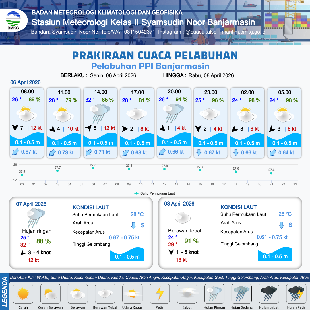 6 Apr 26, 13.00 14 jam kedepan | Barat Laut 3 kt Gust Peningkatan kecepatan angin yang singkat dan tiba-tiba : 5 kt | 0.2 m Tenang | Selatan 0.8 Knot | 9 km | 25 °C | 95 % | +0.66 m | |