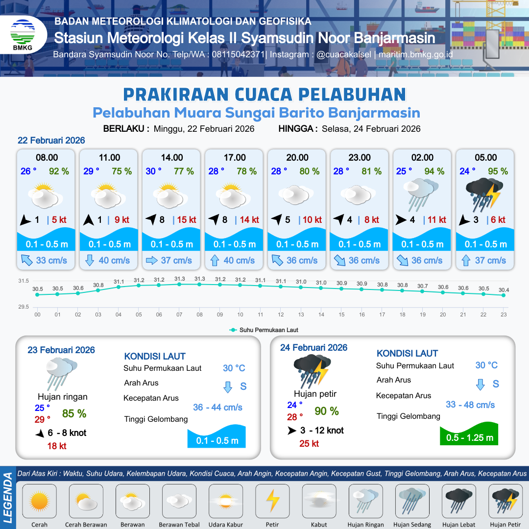 21 Feb 26, 08.00 13 jam yang lalu | Berawan Tebal | Barat Daya 4 kt Gust Peningkatan kecepatan angin yang singkat dan tiba-tiba : 11 kt | | | 10 km | 30 °C | 74 % | -0.37 m |