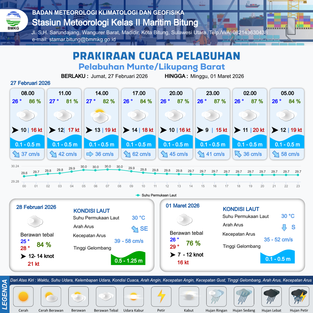 27 Feb 26, 23.00 3 jam kedepan | Berawan Tebal | Barat 12 kt Gust Peningkatan kecepatan angin yang singkat dan tiba-tiba : 20 kt | | | 10 km | 27 °C | 84 % | -0.01 m |