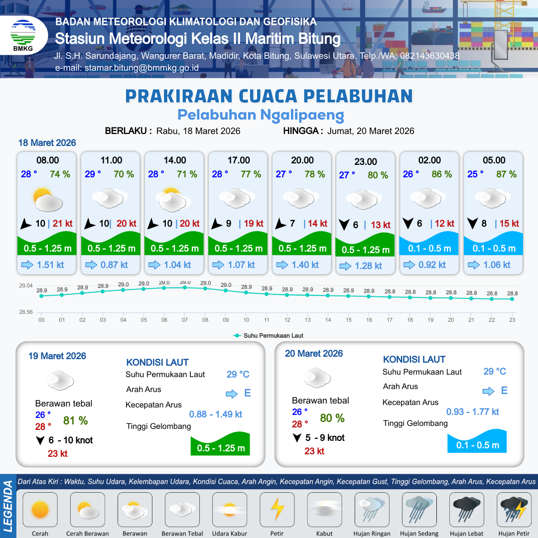18 Mar 26, 19.00 3 jam kedepan | Utara 6 kt Gust Peningkatan kecepatan angin yang singkat dan tiba-tiba : 12 kt | 0.5 m Rendah | Timur 0.9 Knot | 10 km | 26 °C | 86 % | -0.18 m | |