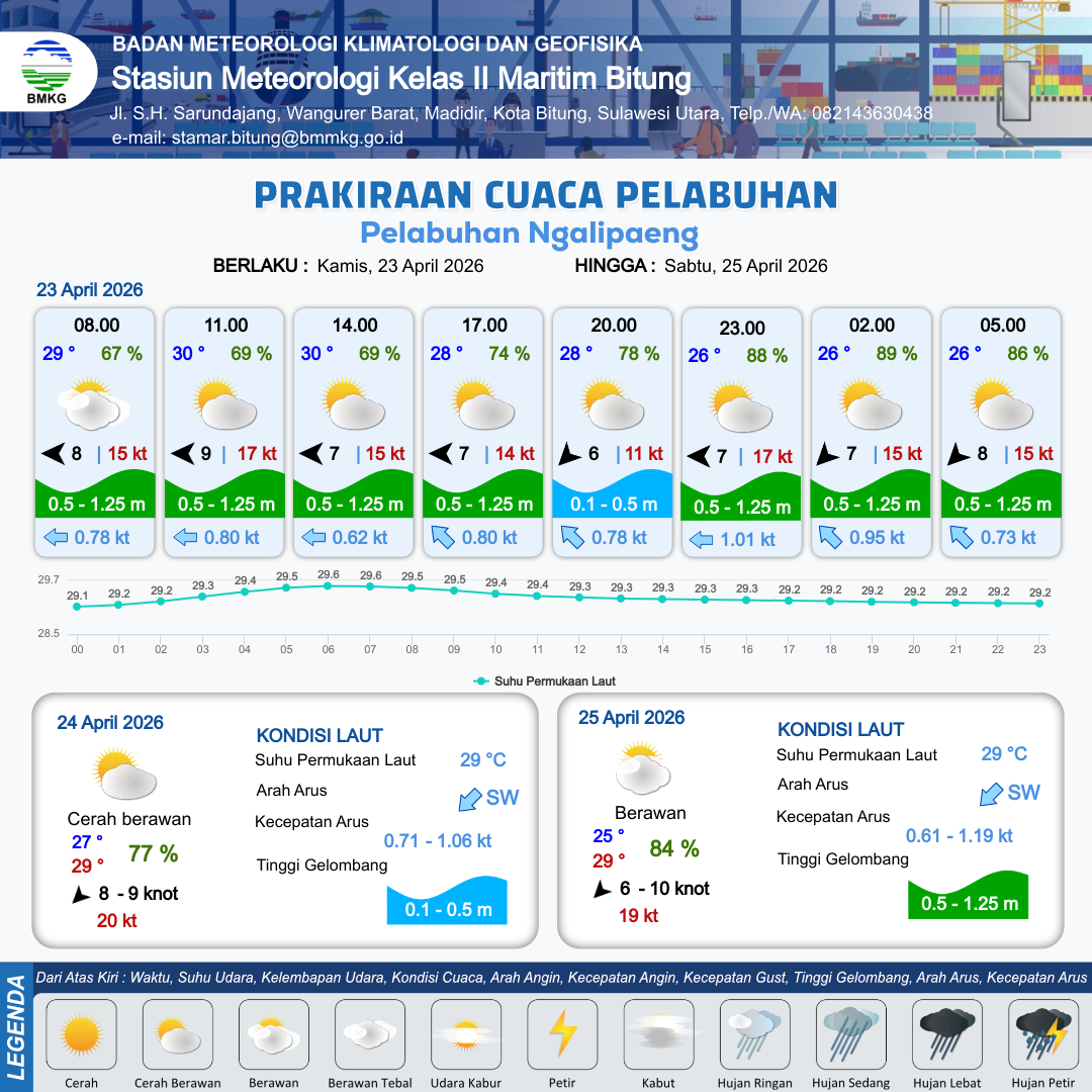 23 Apr 26, 19.00 8 jam kedepan | Timur Laut 7 kt Gust Peningkatan kecepatan angin yang singkat dan tiba-tiba : 17 kt | 0.6 m Rendah | Barat Laut 0.8 Knot | 9 km | 25 °C | 89 % | -0.30 m | |