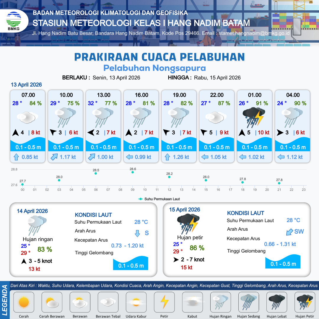 13 Apr 26, 23.00 3 jam kedepan | Hujan Ringan | Selatan 5 kt Gust Peningkatan kecepatan angin yang singkat dan tiba-tiba : 13 kt | | | 6 km | 24 °C | 93 % | +0.56 m |