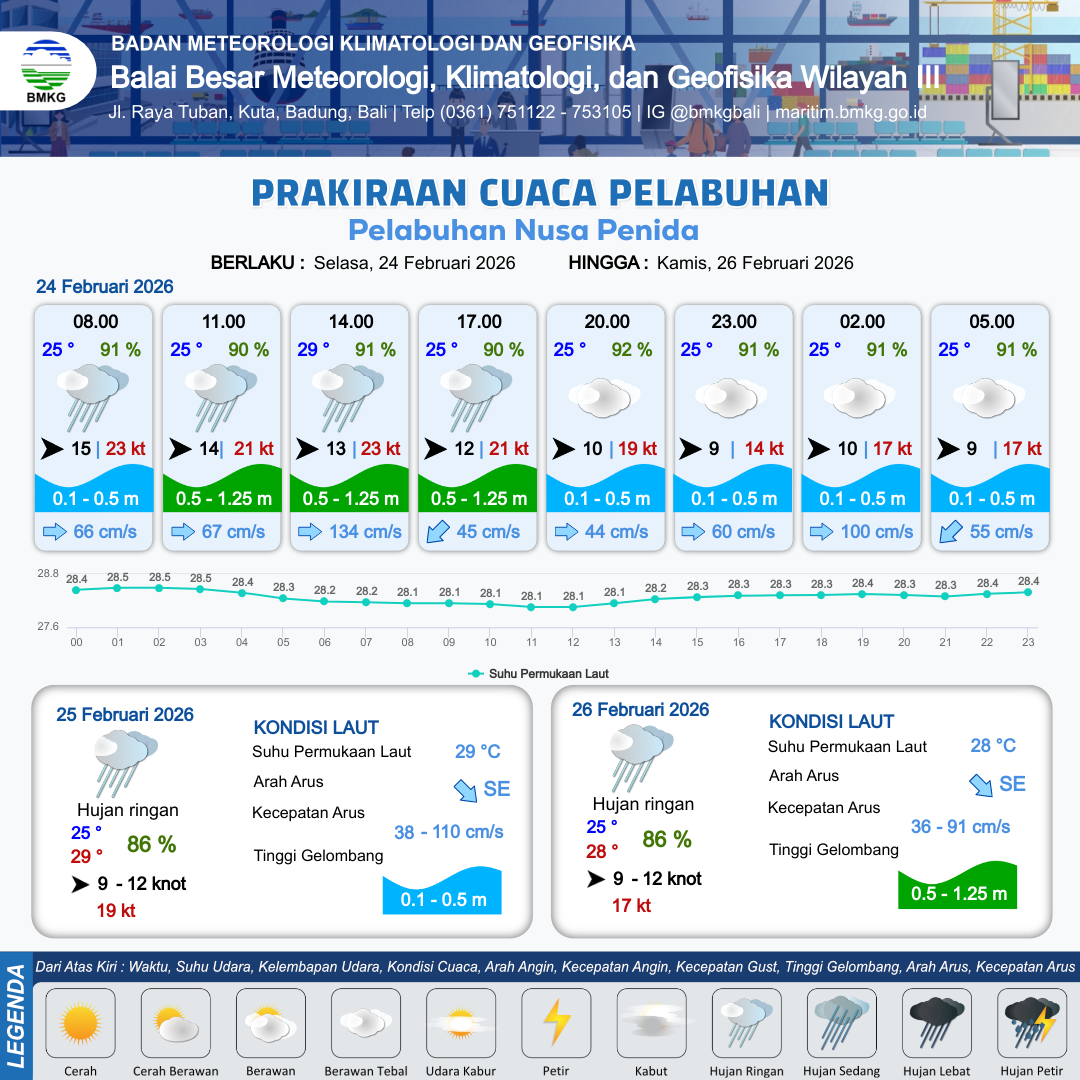 23 Feb 26, 08.00 12 jam yang lalu | Hujan Ringan | Barat 20 kt Gust Peningkatan kecepatan angin yang singkat dan tiba-tiba : 16 kt | | | 9 km | 28 °C | 86 % | +0.48 m |