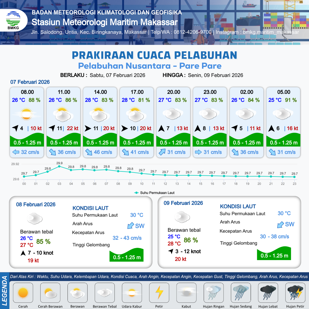 6 Feb 26, 21.00 3 jam kedepan | Berawan Tebal | Barat 6 kt Gust Peningkatan kecepatan angin yang singkat dan tiba-tiba : 13 kt | | | 10 km | 26 °C | 89 % | +0.28 m |