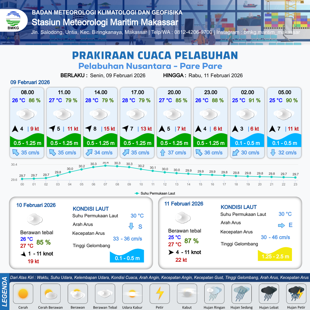 7 Feb 26, 23.00 3 jam kedepan | Berawan Tebal | Selatan 8 kt Gust Peningkatan kecepatan angin yang singkat dan tiba-tiba : 17 kt | | | 10 km | 25 °C | 90 % | +0.34 m |