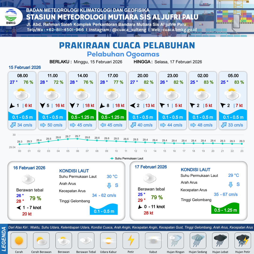 15 Feb 26, 08.00 13 jam yang lalu | Berawan | Timur Laut 8 kt Gust Peningkatan kecepatan angin yang singkat dan tiba-tiba : 17 kt | | | 10 km | 28 °C | 77 % | +0.64 m |