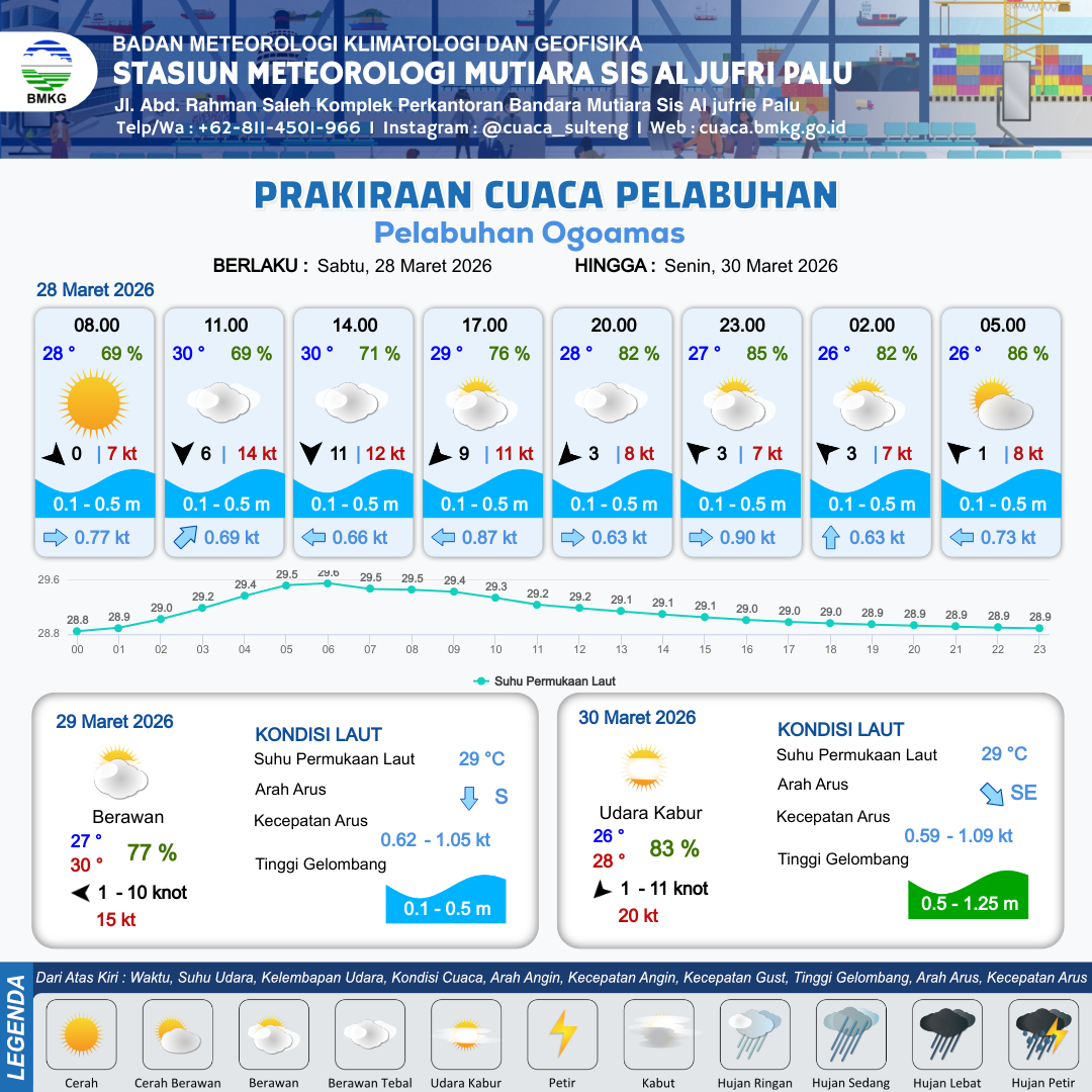 28 Mar 26, 12.00 2 jam kedepan | Timur Laut 3 kt Gust Peningkatan kecepatan angin yang singkat dan tiba-tiba : 8 kt | 0.3 m Tenang | Barat 0.6 Knot | 10 km | 28 °C | 82 % | -0.17 m | |