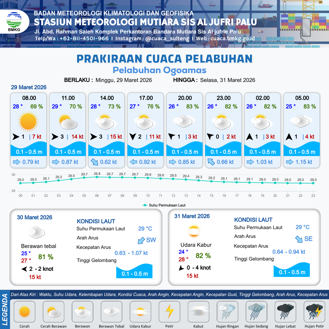 29 Mar 26, 08.00 2 jam kedepan | Utara 2 kt Gust Peningkatan kecepatan angin yang singkat dan tiba-tiba : 10 kt | 0.3 m Tenang | Barat 0.8 Knot | 10 km | 28 °C | 73 % | +0.54 m | |
