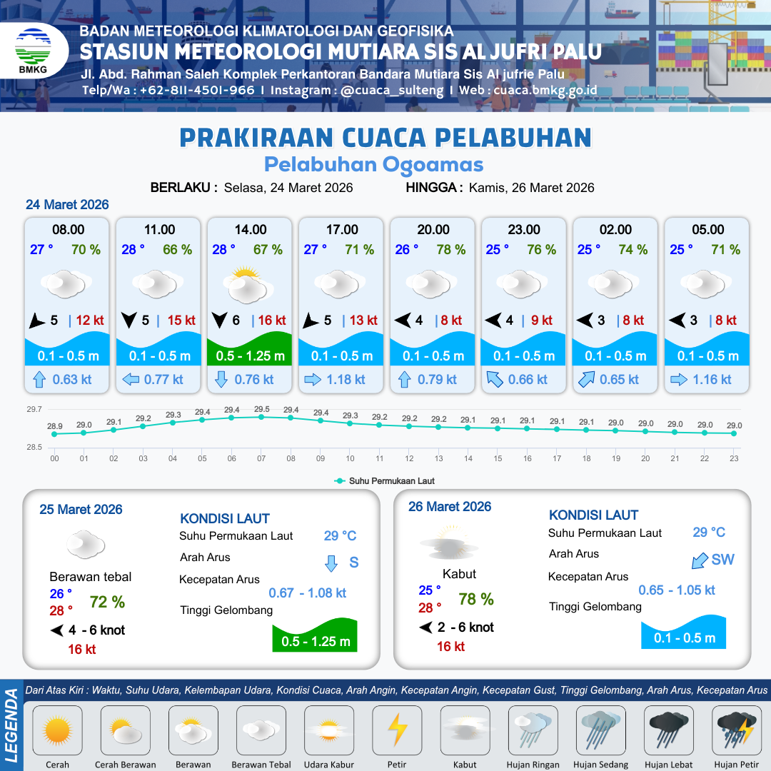 24 Mar 26, 06.00 4 jam kedepan | Utara 6 kt Gust Peningkatan kecepatan angin yang singkat dan tiba-tiba : 16 kt | 0.6 m Rendah | Selatan 0.8 Knot | 10 km | 28 °C | 67 % | -0.45 m | |