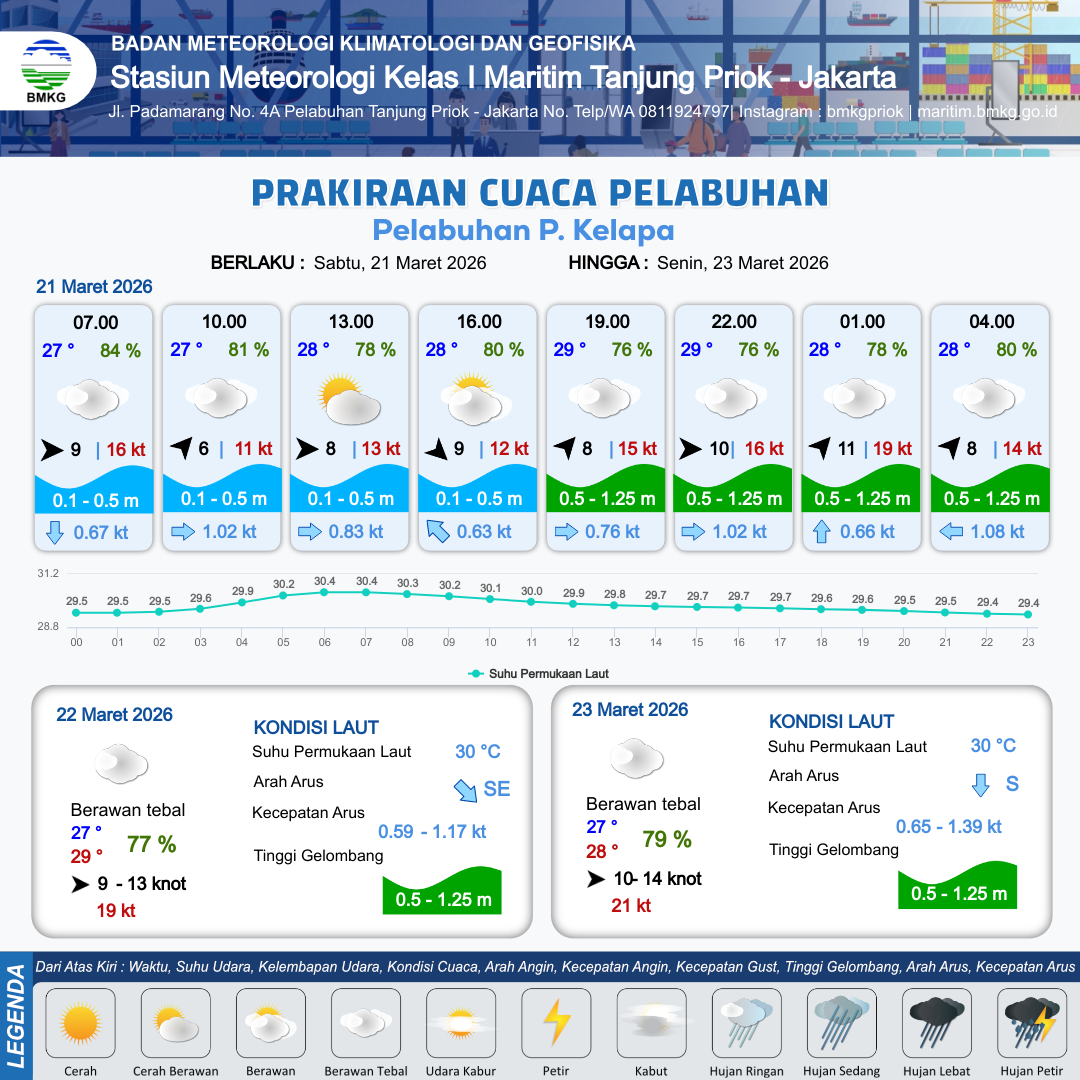 21 Mar 26, 00.00 19 jam yang lalu | Berawan Tebal | Barat 9 kt Gust Peningkatan kecepatan angin yang singkat dan tiba-tiba : 16 kt | | | 10 km | 27 °C | 84 % | +0.08 m |