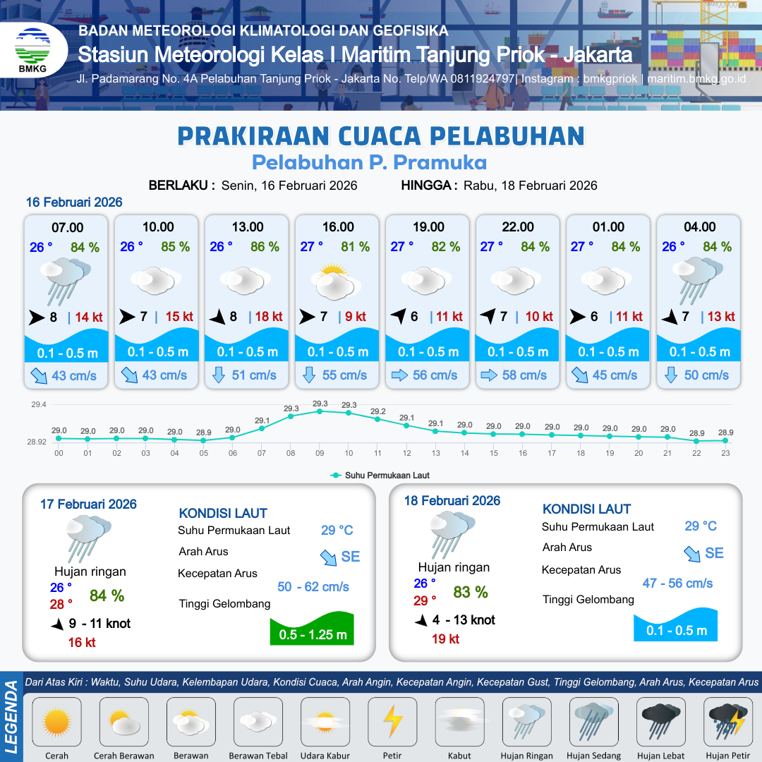 16 Feb 26, 20.00 2 jam kedepan | Hujan Ringan | Barat Laut 7 kt Gust Peningkatan kecepatan angin yang singkat dan tiba-tiba : 15 kt | | | 10 km | 26 °C | 86 % | +0.19 m |