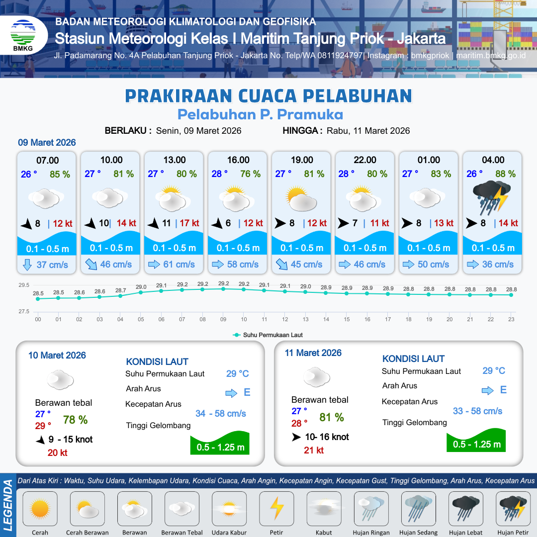 9 Mar 26, 20.00 3 jam kedepan | Hujan Petir | Barat 8 kt Gust Peningkatan kecepatan angin yang singkat dan tiba-tiba : 15 kt | | | 10 km | 26 °C | 85 % | +0.10 m |