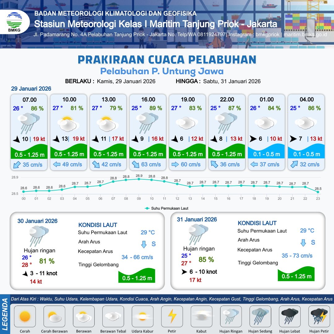 29 Jan 26, 21.00 13 jam kedepan | Barat 7 kt Gust Peningkatan kecepatan angin yang singkat dan tiba-tiba : 13 kt | 0.5 m Rendah | Timur Laut 32.0 cm/s | 10 km | 25 °C | 86 % | +0.05 m | |