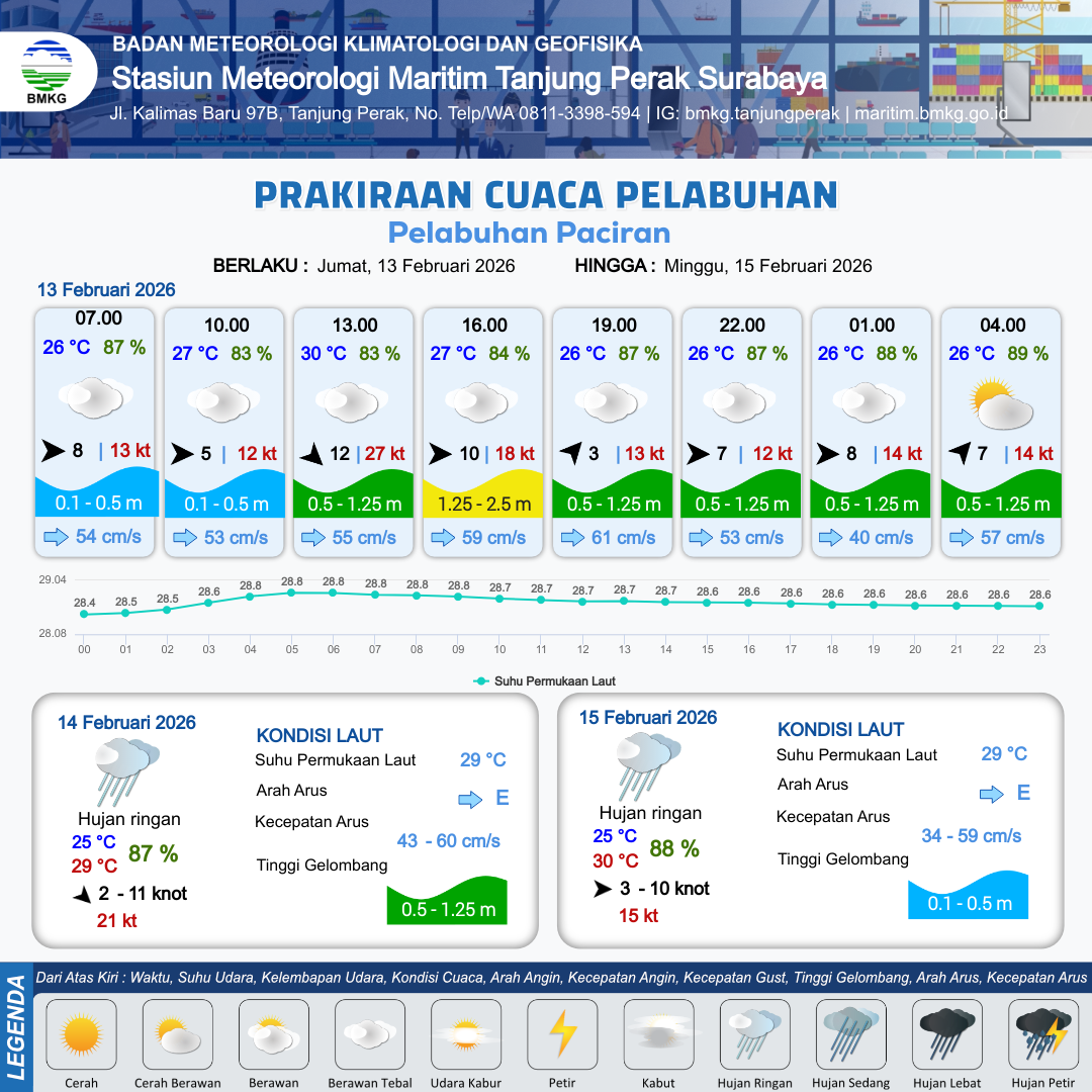 13 Feb 26, 14.00 4 jam kedepan | Barat 7 kt Gust Peningkatan kecepatan angin yang singkat dan tiba-tiba : 7 kt | 1.1 m Rendah | Timur 57.0 cm/s | 10 km | 26 °C | 90 % | +0.25 m | |