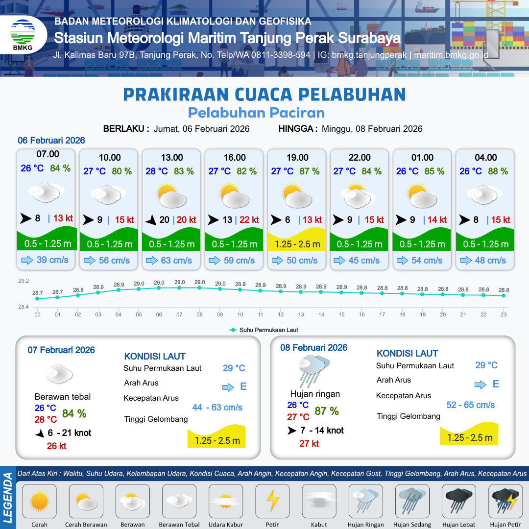6 Feb 26, 21.00 12 jam kedepan | Barat 8 kt Gust Peningkatan kecepatan angin yang singkat dan tiba-tiba : 15 kt | 0.8 m Rendah | Timur 48.0 cm/s | 10 km | 26 °C | 88 % | -0.24 m | |