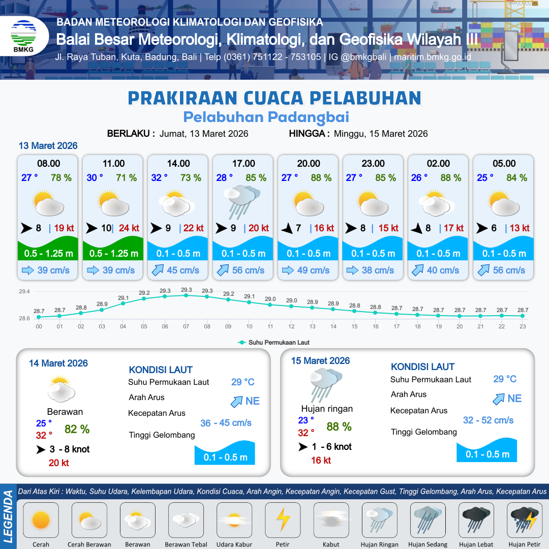 12 Mar 26, 13.00 5 jam yang lalu | Cerah Berawan | Barat 5 kt Gust Peningkatan kecepatan angin yang singkat dan tiba-tiba : 18 kt | | | 9 km | 25 °C | 80 % | -0.18 m |