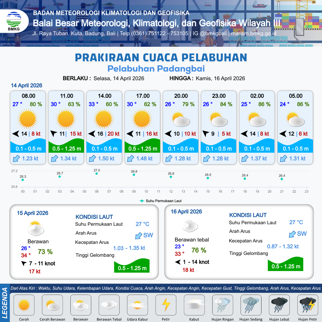 14 Apr 26, 23.00 2 jam kedepan | Timur 11 kt Gust Peningkatan kecepatan angin yang singkat dan tiba-tiba : 6 kt | 0.5 m Rendah | Barat Daya 1.1 Knot | 10 km | 24 °C | 86 % | +0.45 m |