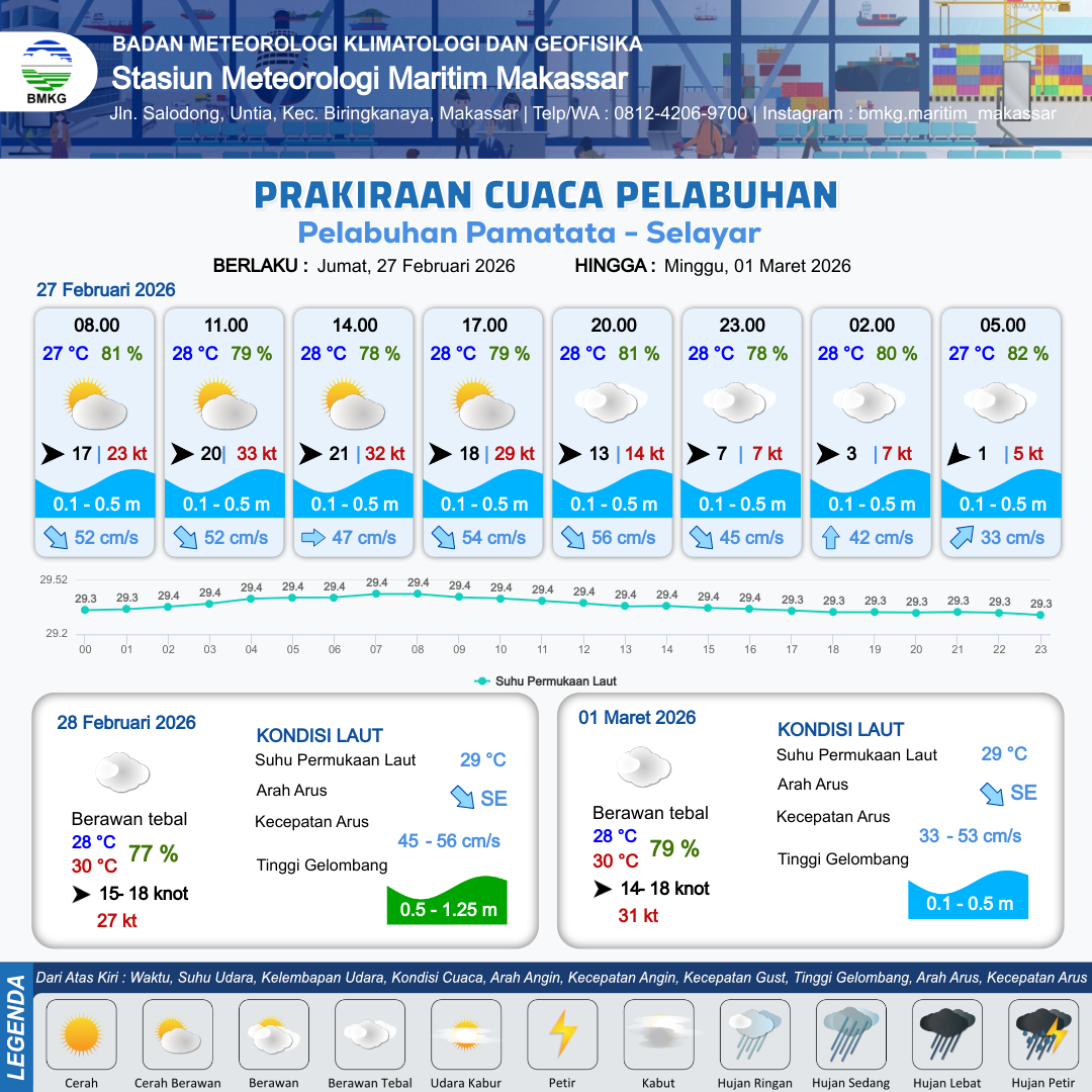 27 Feb 26, 06.00 14 jam yang lalu | Cerah Berawan | Barat 21 kt Gust Peningkatan kecepatan angin yang singkat dan tiba-tiba : 32 kt | | | 10 km | 28 °C | 78 % | -0.04 m |