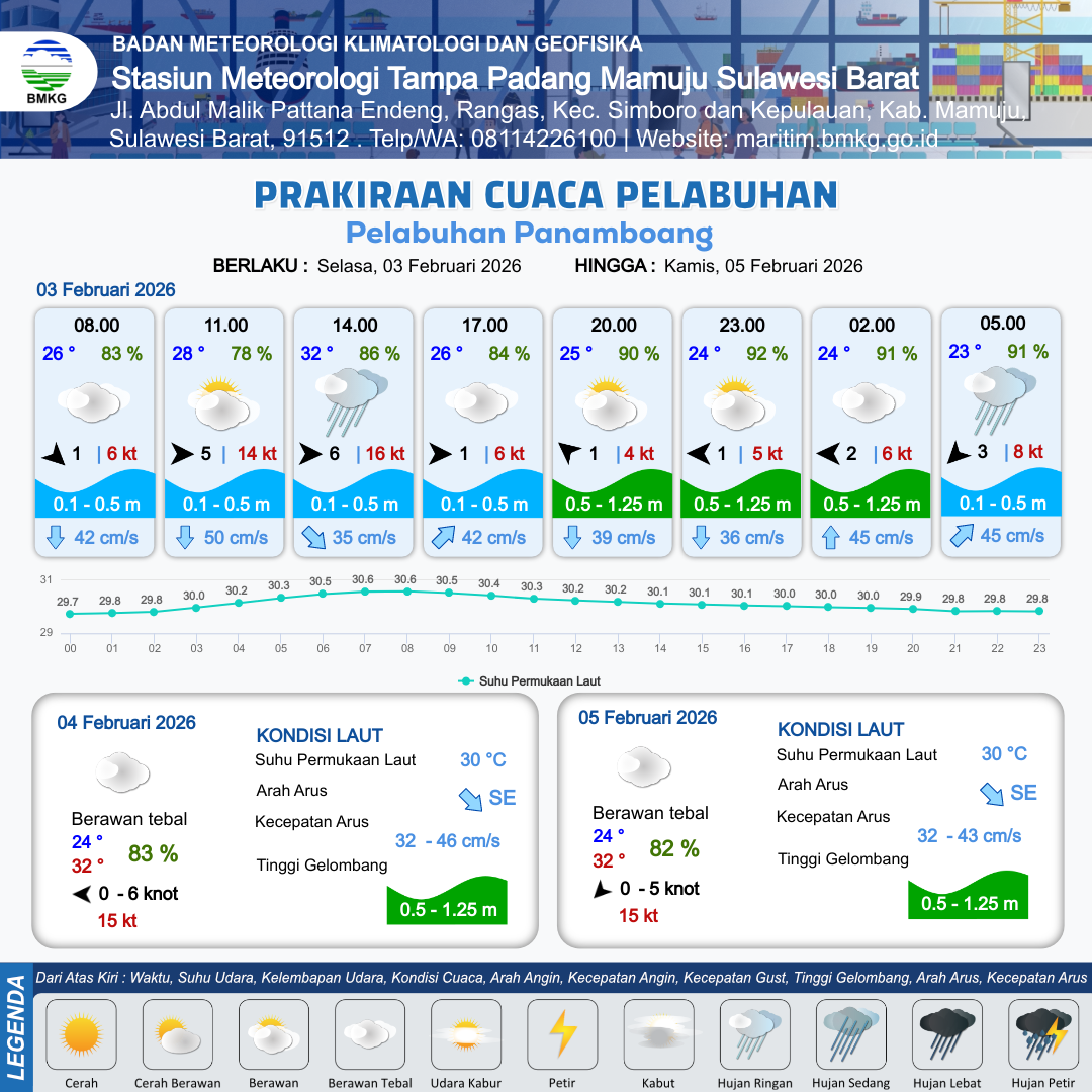 3 Feb 26, 23.00 4 jam kedepan | Berawan | Barat Laut 3 kt Gust Peningkatan kecepatan angin yang singkat dan tiba-tiba : 5 kt | | | 7 km | 24 °C | 90 % | +0.03 m |