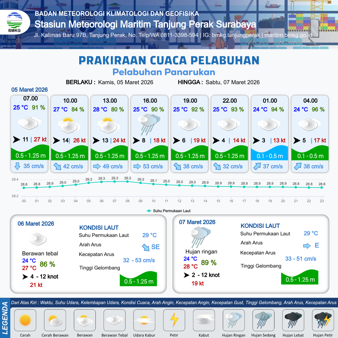 5 Mar 26, 23.00 5 jam kedepan | Berawan Tebal | Barat 7 kt Gust Peningkatan kecepatan angin yang singkat dan tiba-tiba : 21 kt | | | 10 km | 24 °C | 93 % | -0.83 m |