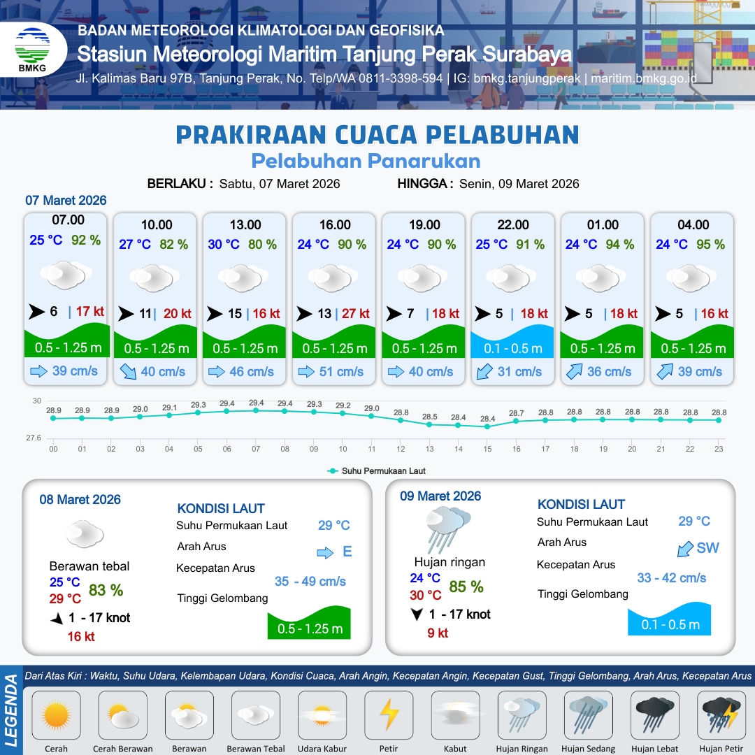 7 Mar 26, 18.00 10 jam kedepan | Barat 5 kt Gust Peningkatan kecepatan angin yang singkat dan tiba-tiba : 18 kt | 0.7 m Rendah | Timur Laut 36.0 cm/s | 10 km | 25 °C | 94 % | +0.34 m | |