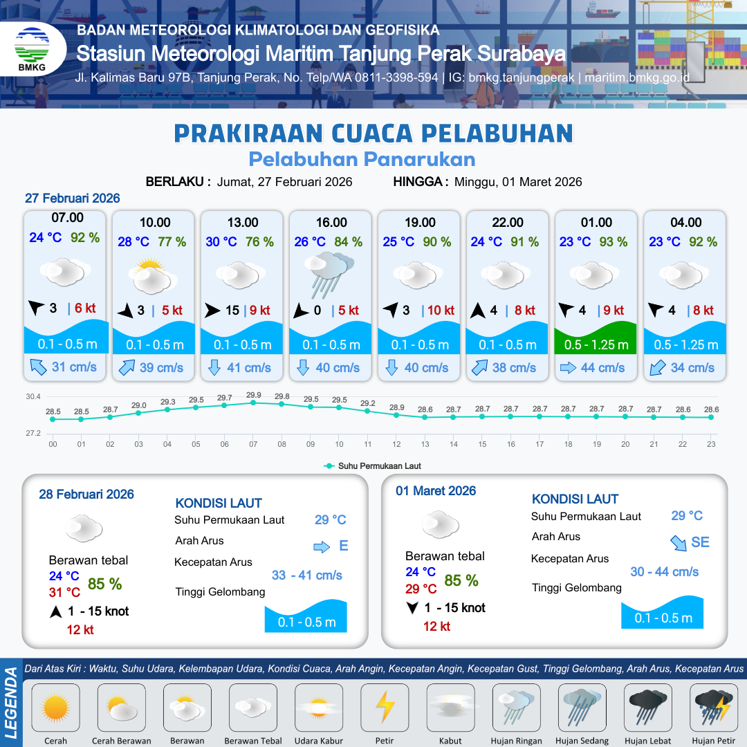 28 Feb 26, 09.00 4 jam kedepan | Barat Laut 15 kt Gust Peningkatan kecepatan angin yang singkat dan tiba-tiba : 11 kt | 0.1 m Tenang | Tenggara 33.0 cm/s | 10 km | 27 °C | 83 % | -0.03 m | |
