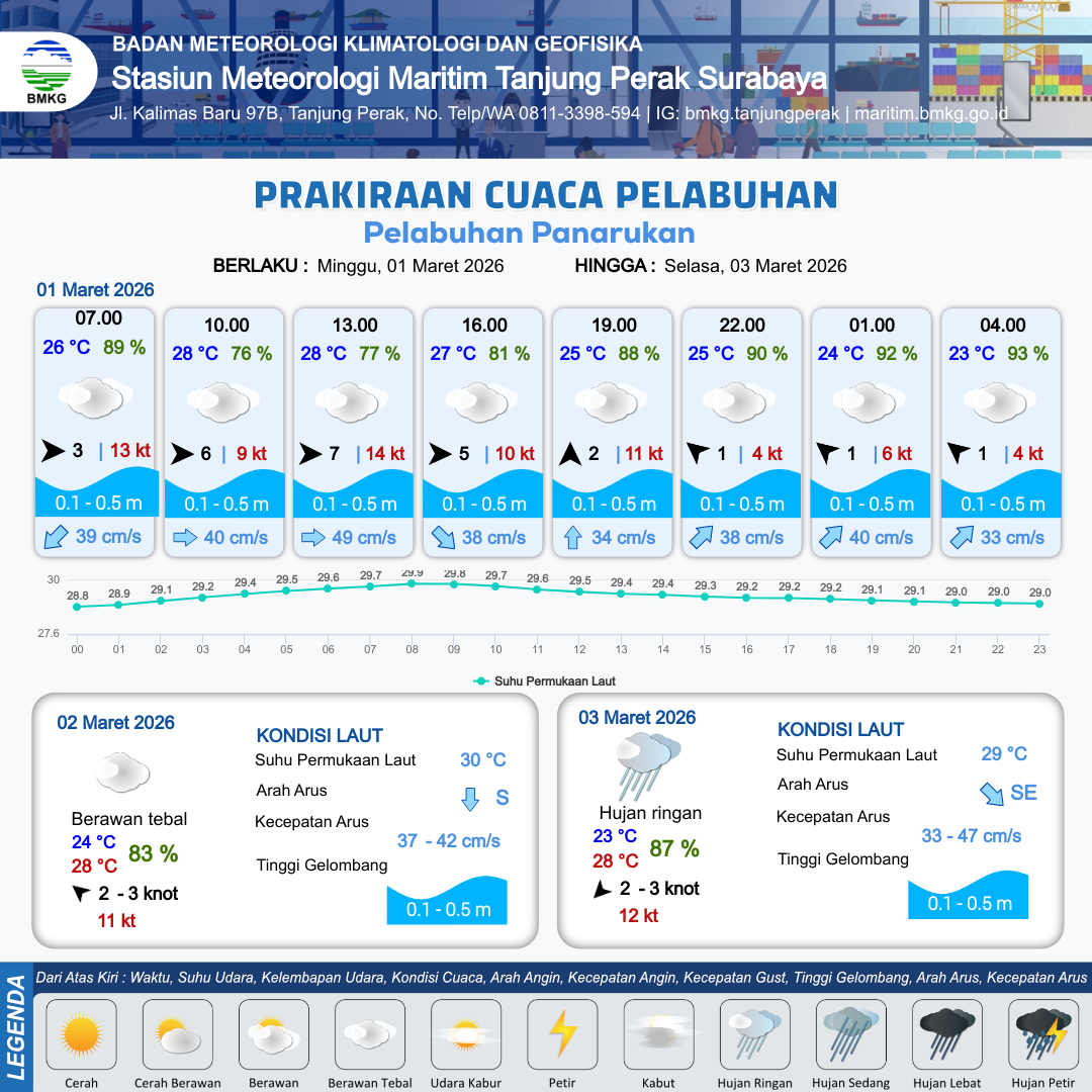 1 Mar 26, 03.00 16 jam yang lalu | Berawan Tebal | Barat 6 kt Gust Peningkatan kecepatan angin yang singkat dan tiba-tiba : 9 kt | | | 10 km | 28 °C | 76 % | +0.69 m |