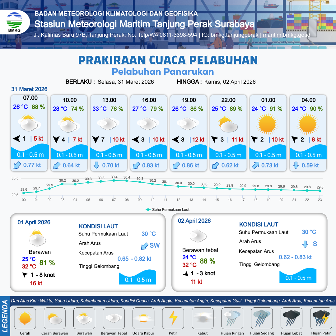 31 Mar 26, 07.00 4 jam kedepan | Utara 7 kt Gust Peningkatan kecepatan angin yang singkat dan tiba-tiba : 10 kt | 0.1 m Tenang | Selatan 0.7 Knot | 10 km | 31 °C | 76 % | -0.17 m | |