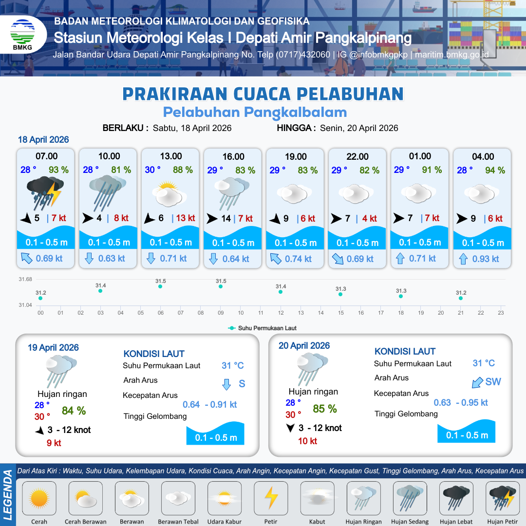 16 Apr 26, 23.00 3 jam kedepan | Berawan | Selatan 5 kt Gust Peningkatan kecepatan angin yang singkat dan tiba-tiba : 10 kt | | | 10 km | 25 °C | 92 % | +0.65 m |