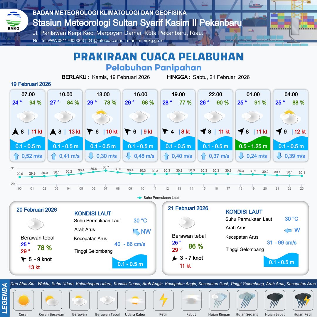 18 Feb 26, 23.00 2 jam kedepan | Berawan | Tenggara 7 kt Gust Peningkatan kecepatan angin yang singkat dan tiba-tiba : 11 kt | | | 8 km | 25 °C | 91 % | +1.73 m |