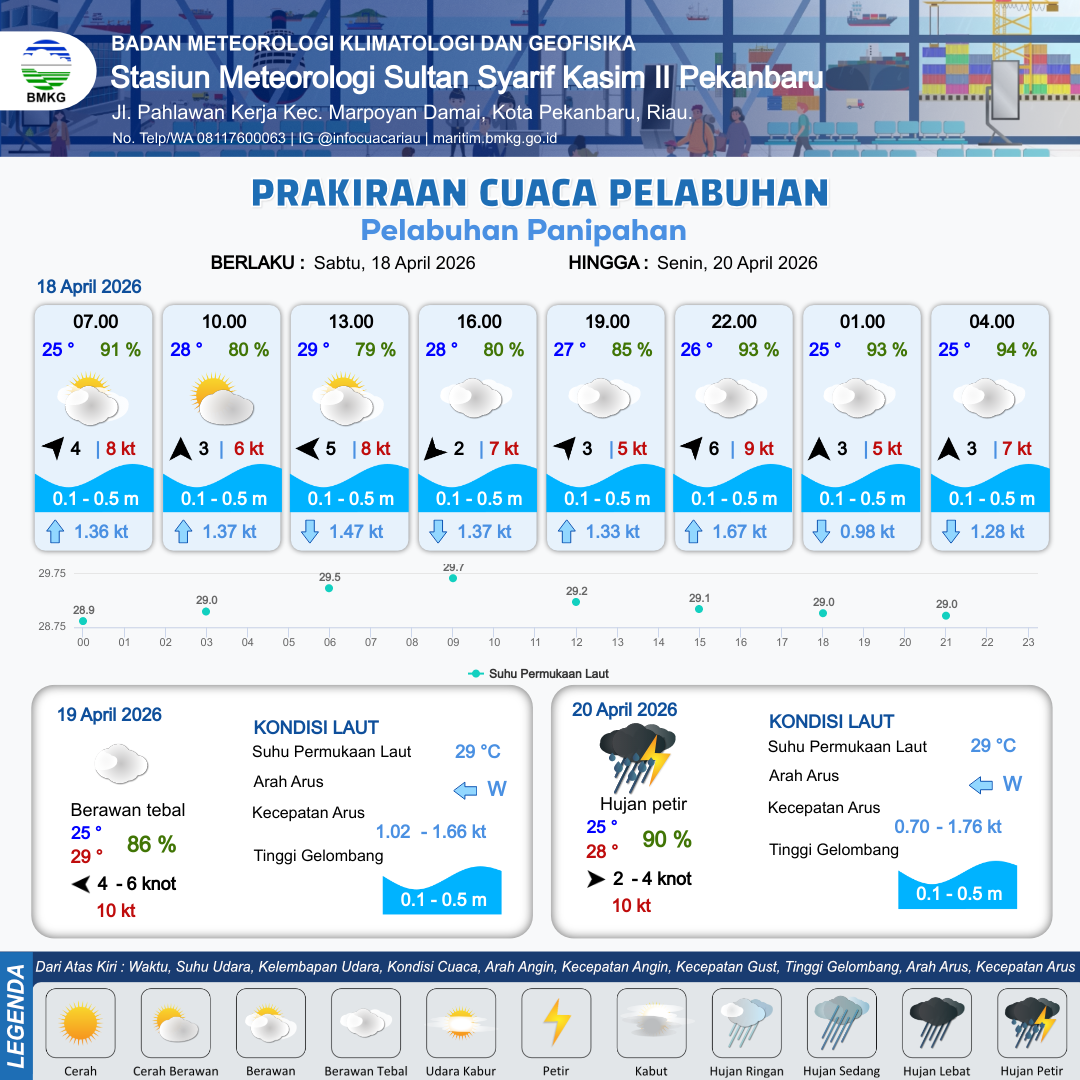 18 Apr 26, 06.00 8 jam kedepan | Timur 5 kt Gust Peningkatan kecepatan angin yang singkat dan tiba-tiba : 8 kt | 0.3 m Tenang | Selatan 1.5 Knot | 9 km | 29 °C | 79 % | +0.60 m | |