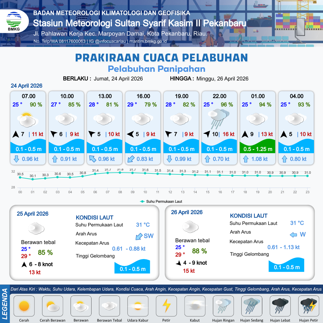 24 Apr 26, 08.00 10 jam kedepan | Timur 5 kt Gust Peningkatan kecepatan angin yang singkat dan tiba-tiba : 9 kt | 0.1 m Tenang | Barat 0.8 Knot | 9 km | 29 °C | 78 % | -0.58 m | |