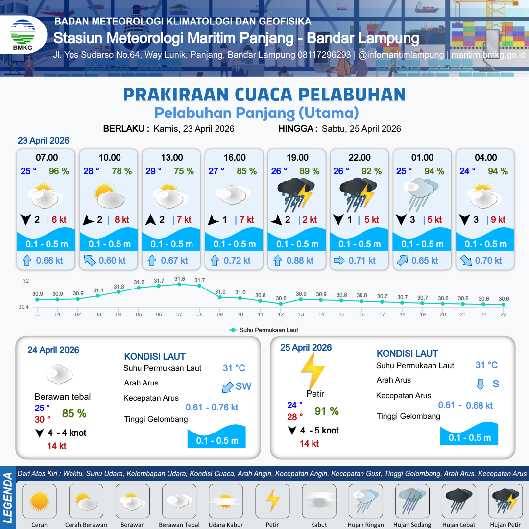 23 Apr 26, 19.00 1 hari 12 jam kedepan | Utara 3 kt Gust Peningkatan kecepatan angin yang singkat dan tiba-tiba : 6 kt | 0.3 m Tenang | Selatan 0.8 Knot | 9 km | 24 °C | 95 % | +0.02 m | |
