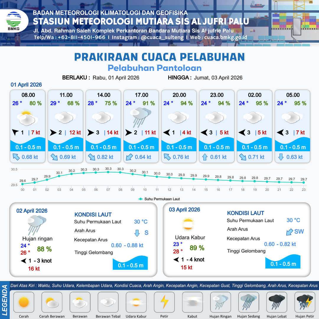1 Apr 26, 13.00 3 jam kedepan | Timur 1 kt Gust Peningkatan kecepatan angin yang singkat dan tiba-tiba : 3 kt | 0.1 m Tenang | Barat Laut 0.7 Knot | 10 km | 24 °C | 94 % | -0.02 m | |