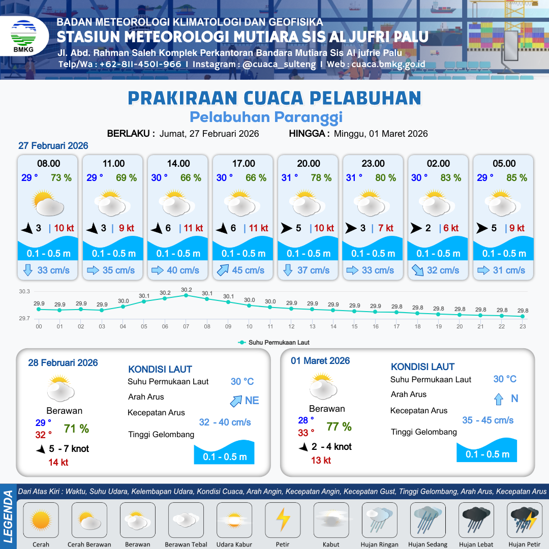 27 Feb 26, 04.00 16 jam yang lalu | Berawan | Barat Laut 3 kt Gust Peningkatan kecepatan angin yang singkat dan tiba-tiba : 8 kt | | | 10 km | 29 °C | 70 % | +0.30 m |