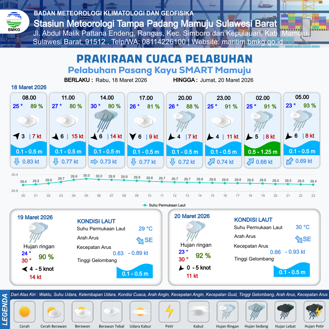 18 Mar 26, 06.00 13 jam yang lalu | Hujan Sedang | Barat Laut 6 kt Gust Peningkatan kecepatan angin yang singkat dan tiba-tiba : 14 kt | | | 9 km | 30 °C | 80 % | +0.03 m |