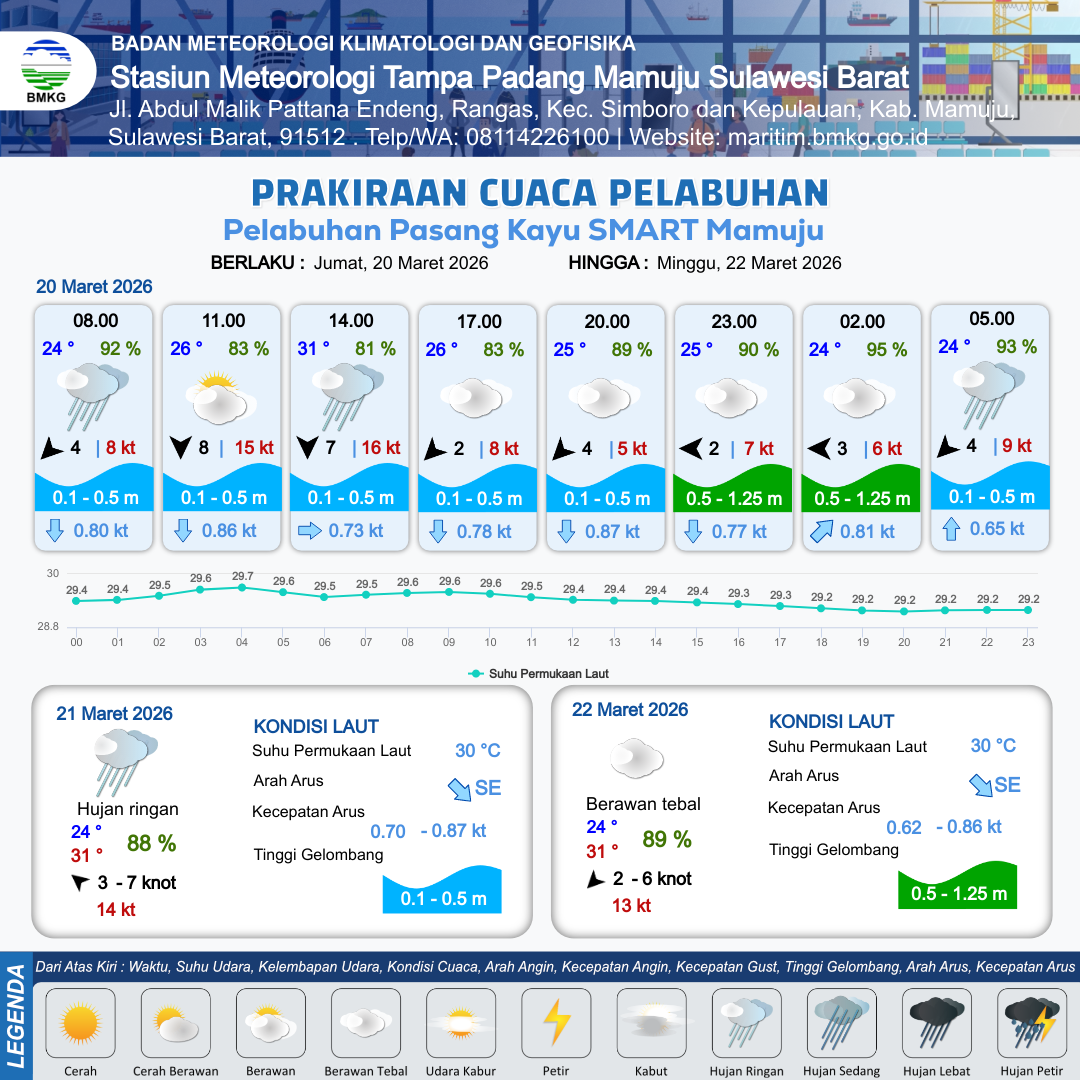 20 Mar 26, 14.00 12 jam kedepan | Timur 2 kt Gust Peningkatan kecepatan angin yang singkat dan tiba-tiba : 8 kt | 0.5 m Rendah | Selatan 0.8 Knot | 7 km | 25 °C | 90 % | +0.05 m | |