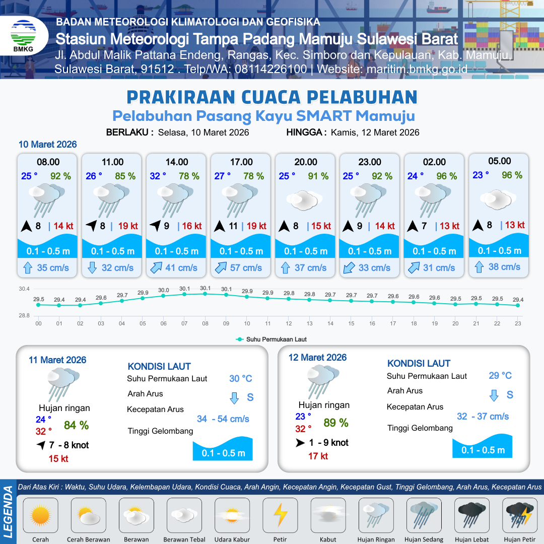 10 Mar 26, 05.00 2 jam kedepan | Barat Daya 9 kt Gust Peningkatan kecepatan angin yang singkat dan tiba-tiba : 17 kt | 0.3 m Tenang | Timur 35.0 cm/s | 7 km | 30 °C | 81 % | -0.06 m | |